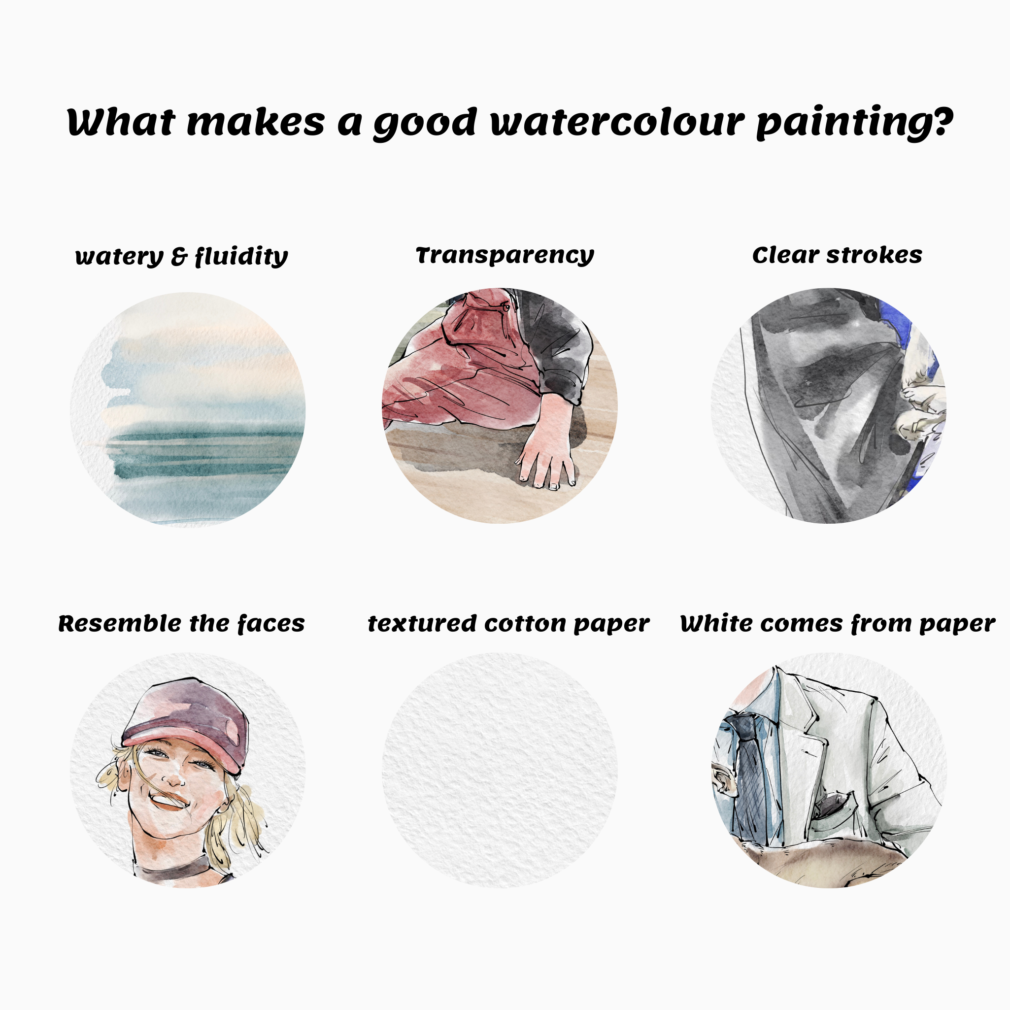 These stunning pieces showcase Watercolor portraits that depict individuals with incredibly realistic and three-dimensional detailed facial features.